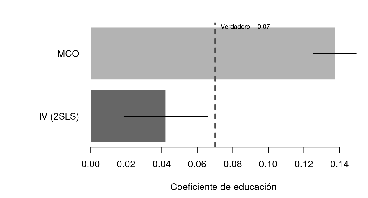 El coeficiente MCO de la educación (0.1375) sobreestima sustancialmente el valor verdadero (0.07). El estimador IV (0.0423) se acerca más al verdadero. Nótese que los errores estándar de IV son mayores — este es el coste inevitable de corregir la endogeneidad.