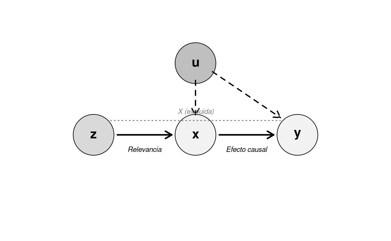 Figure 6.2: Diagrama causal. El instrumento z afecta a x (relevancia, flecha sólida) pero no a y directamente (exogeneidad, flecha tachada). La variable omitida u afecta a x y a y, generando la endogeneidad.