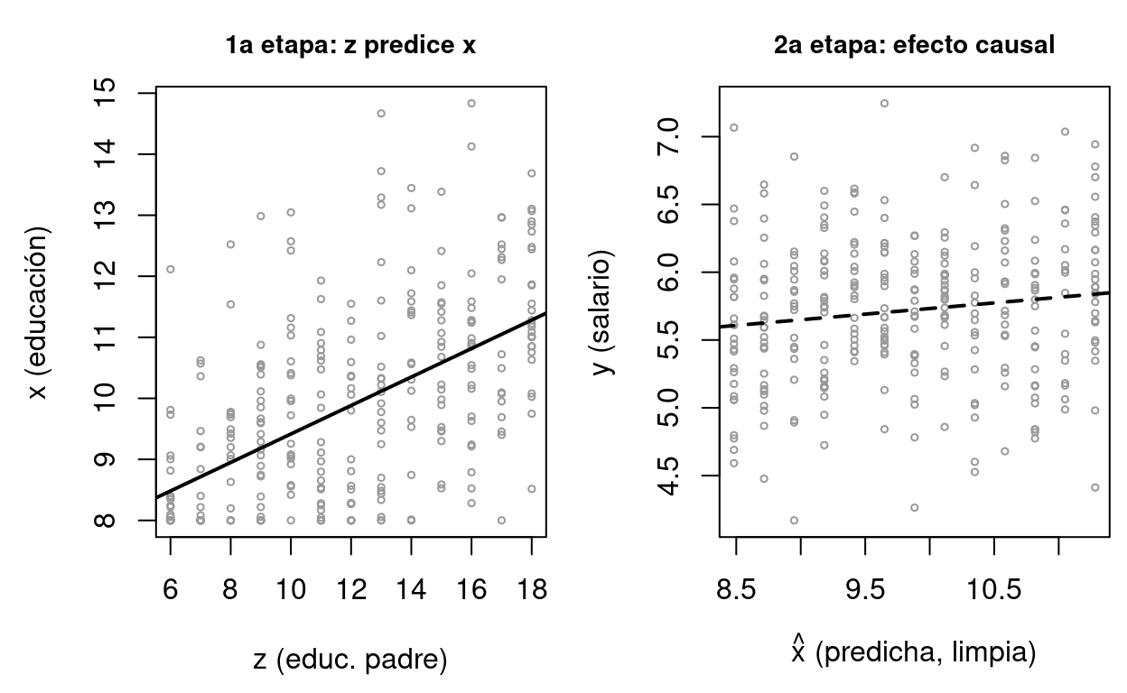 Segunda etapa — estimar el efecto: Regresar \(y\) sobre \(\hat{x}\) y los controles: