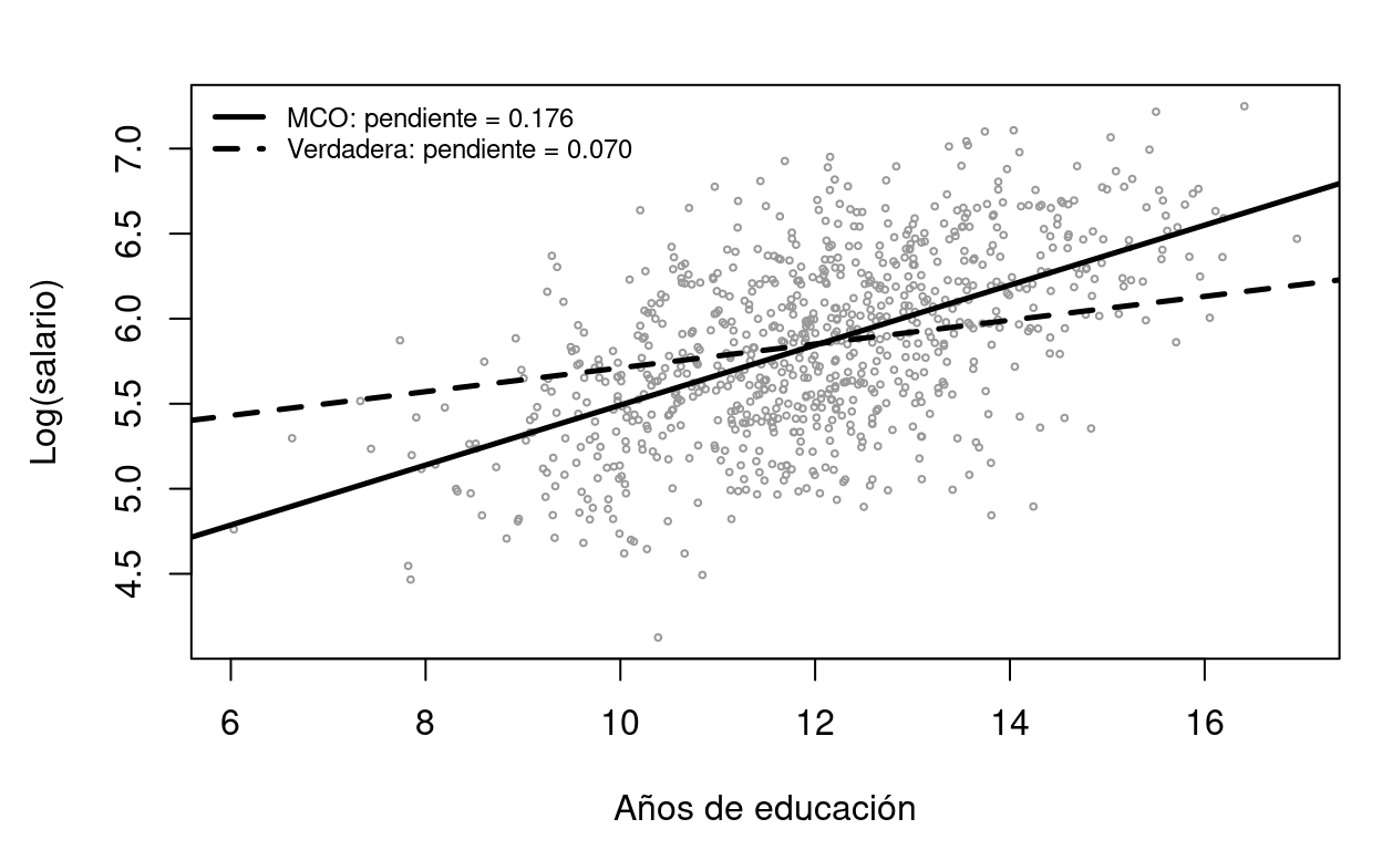 El gráfico muestra cómo la nube de puntos “engaña” a MCO: los individuos con alta habilidad aparecen arriba a la derecha (más educados y mejor pagados), tirando la recta hacia arriba. MCO interpreta esta correlación como efecto de la educación, cuando en parte es efecto de la habilidad.
