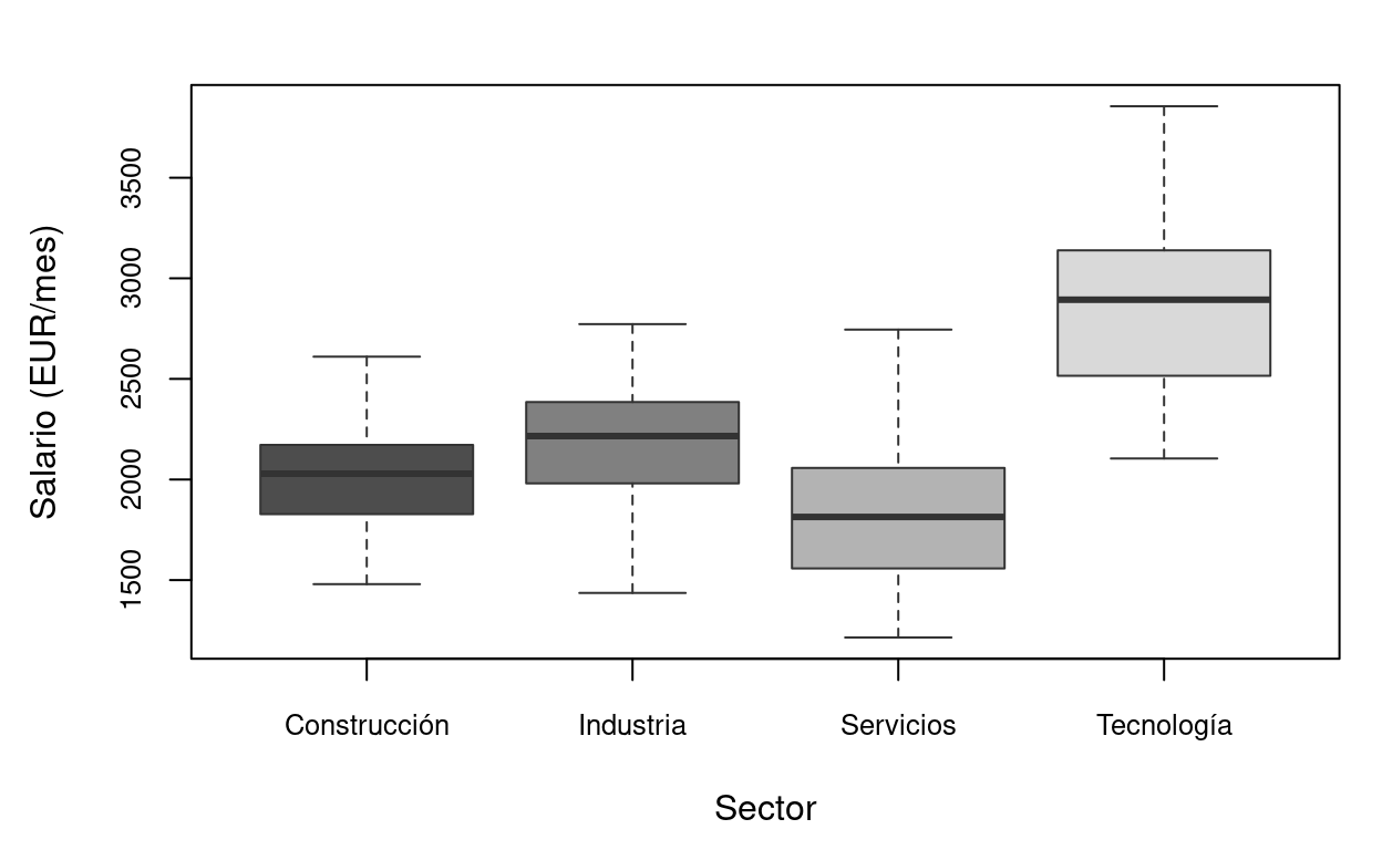 Figure 8.2: ANOVA de una vía: salarios por sector económico. Las cajas muestran la distribución de salarios en cada sector. Las diferencias entre medianas (líneas horizontales gruesas) son lo que el test F de ANOVA contrasta.