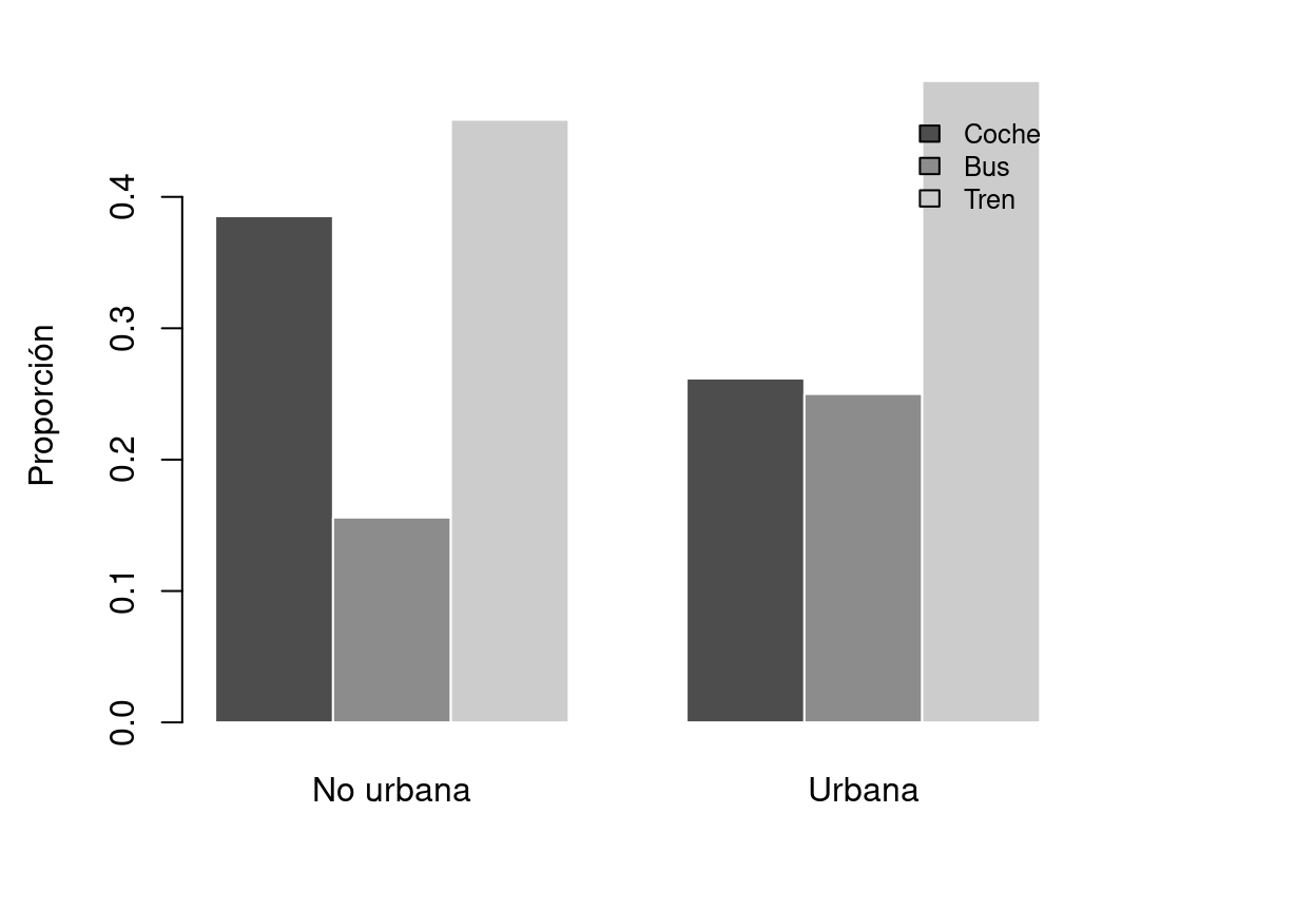 Figure 8.4: Distribución de la elección de transporte por zona. En la zona urbana, bus y tren captan más cuota. En la no urbana, el coche domina.