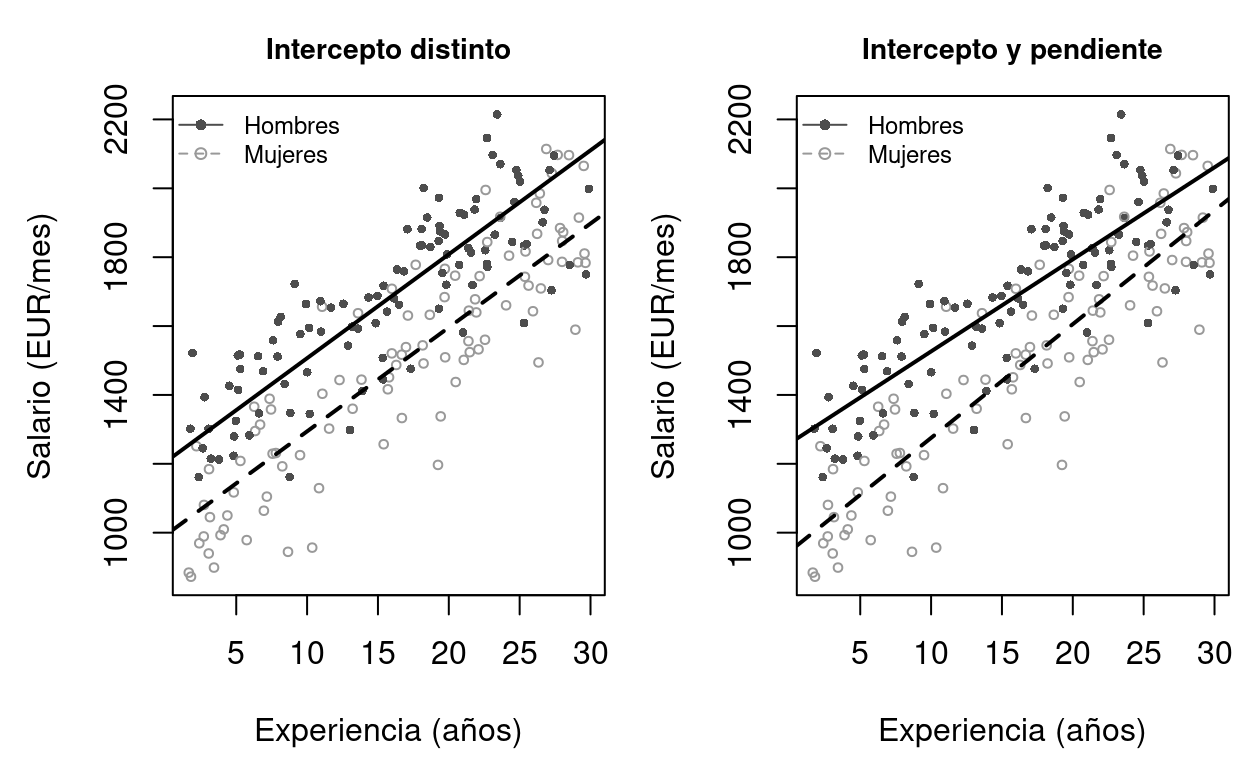 Figure 8.1: Efecto de las variables dummy en la regresión. Izquierda: una dummy de sexo desplaza el intercepto (líneas paralelas). Derecha: se puede añadir una interacción con la experiencia para permitir pendientes distintas.