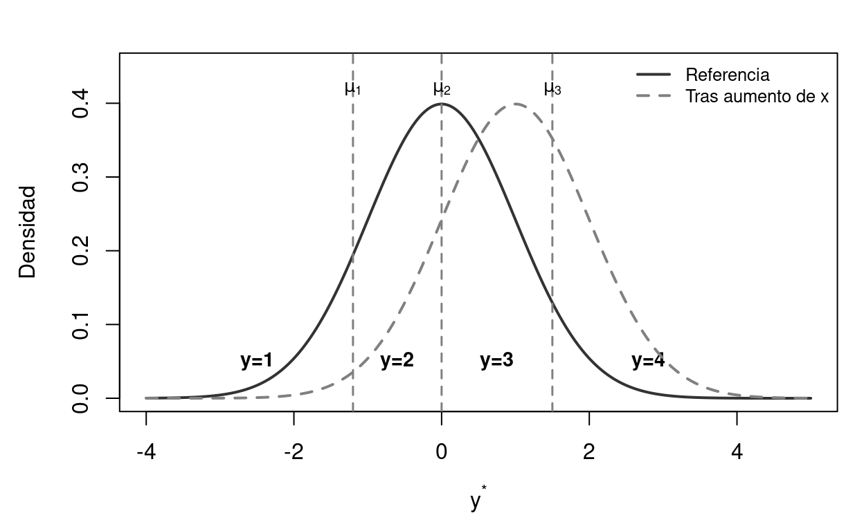 Figure 8.3: Variable latente y umbrales en el modelo ordenado. La distribución se divide en categorías por los umbrales mu. Un cambio en x (línea discontinua) desplaza la distribución, alterando las probabilidades de cada categoría.